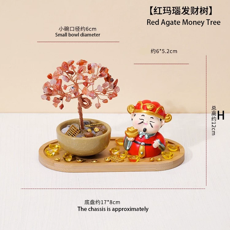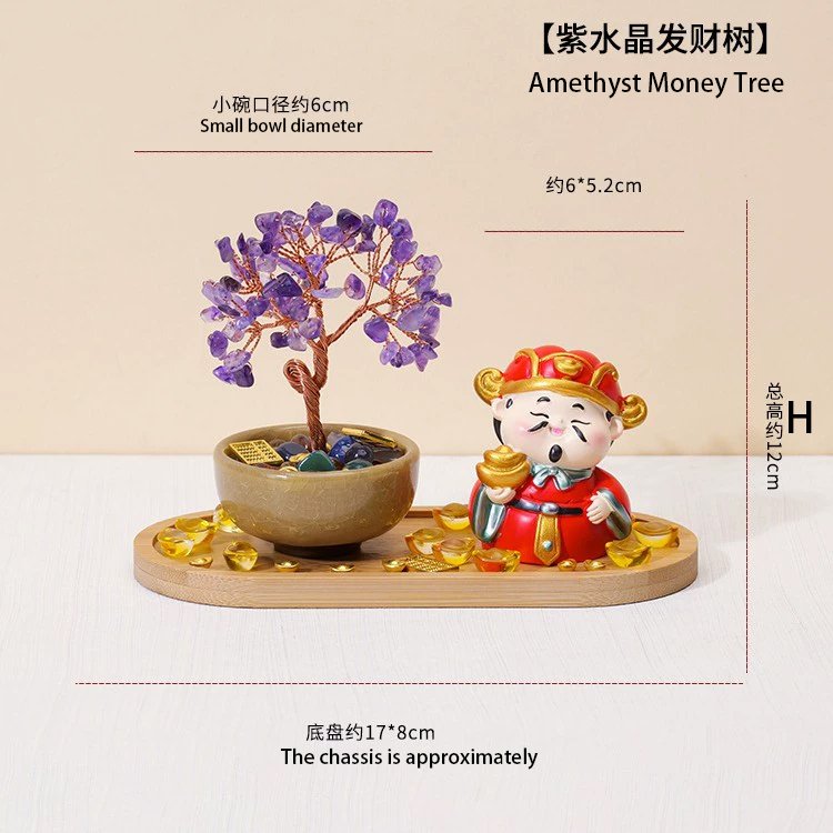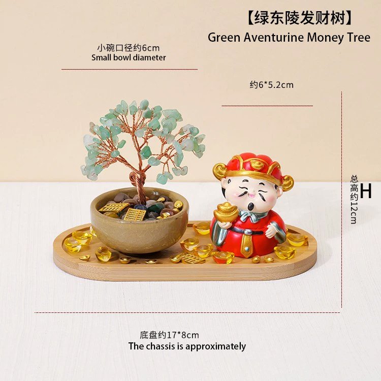 In the celestial realm, the God of Wealth gazed upon the mortal world and saw many hardworking people struggling to find their fortune. He decided to create a gift to guide them. Using the purest elements of Earth, he began to craft a tree. For its trunk, he chose **Green Aventurine**, the stone of growth and opportunity, as a foundation for steady, flourishing luck. Its rich green color symbolized the sprouting seeds of future endeavors.