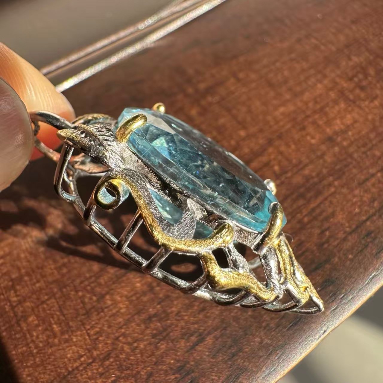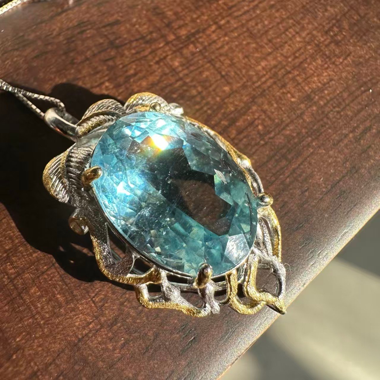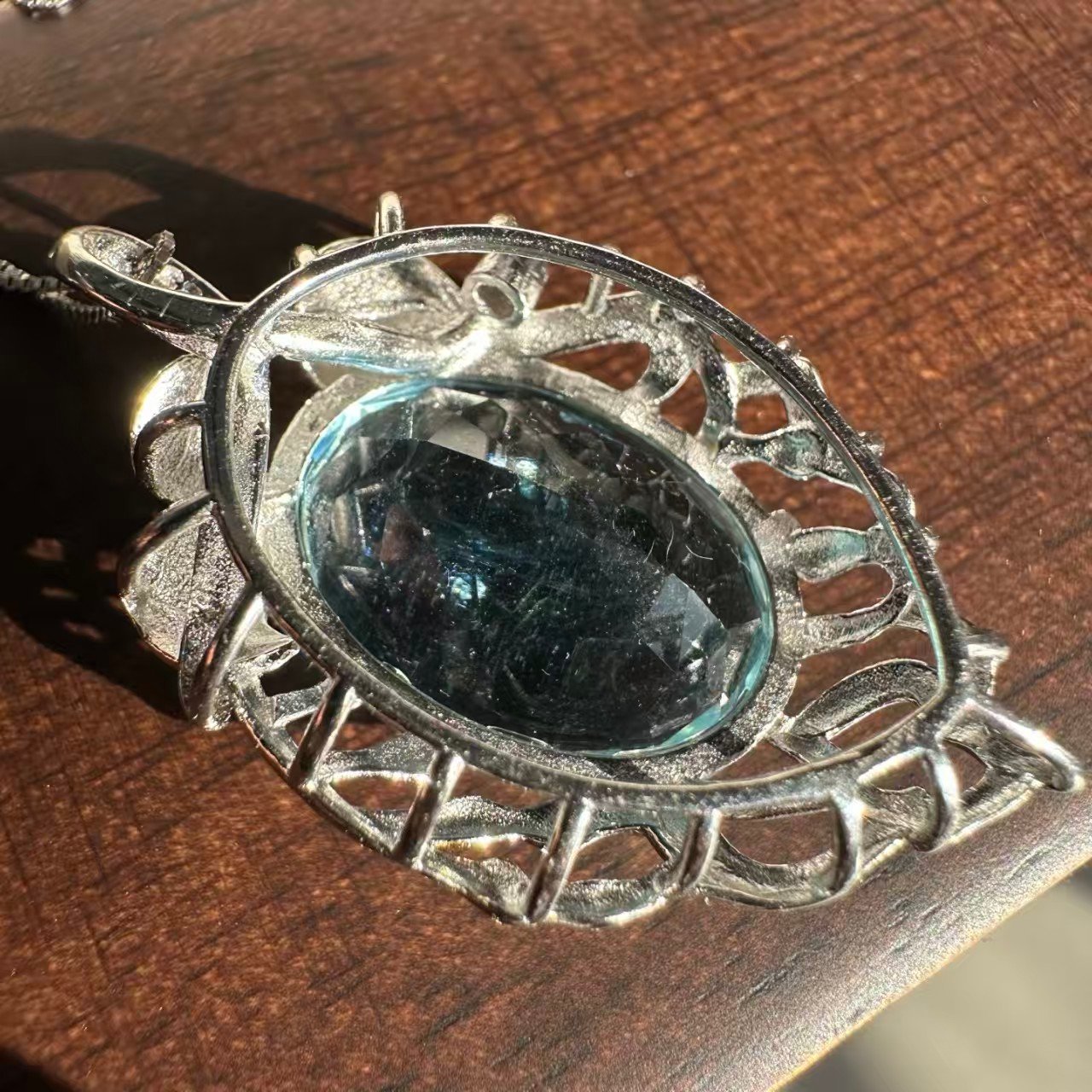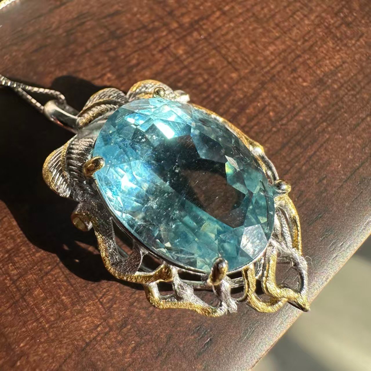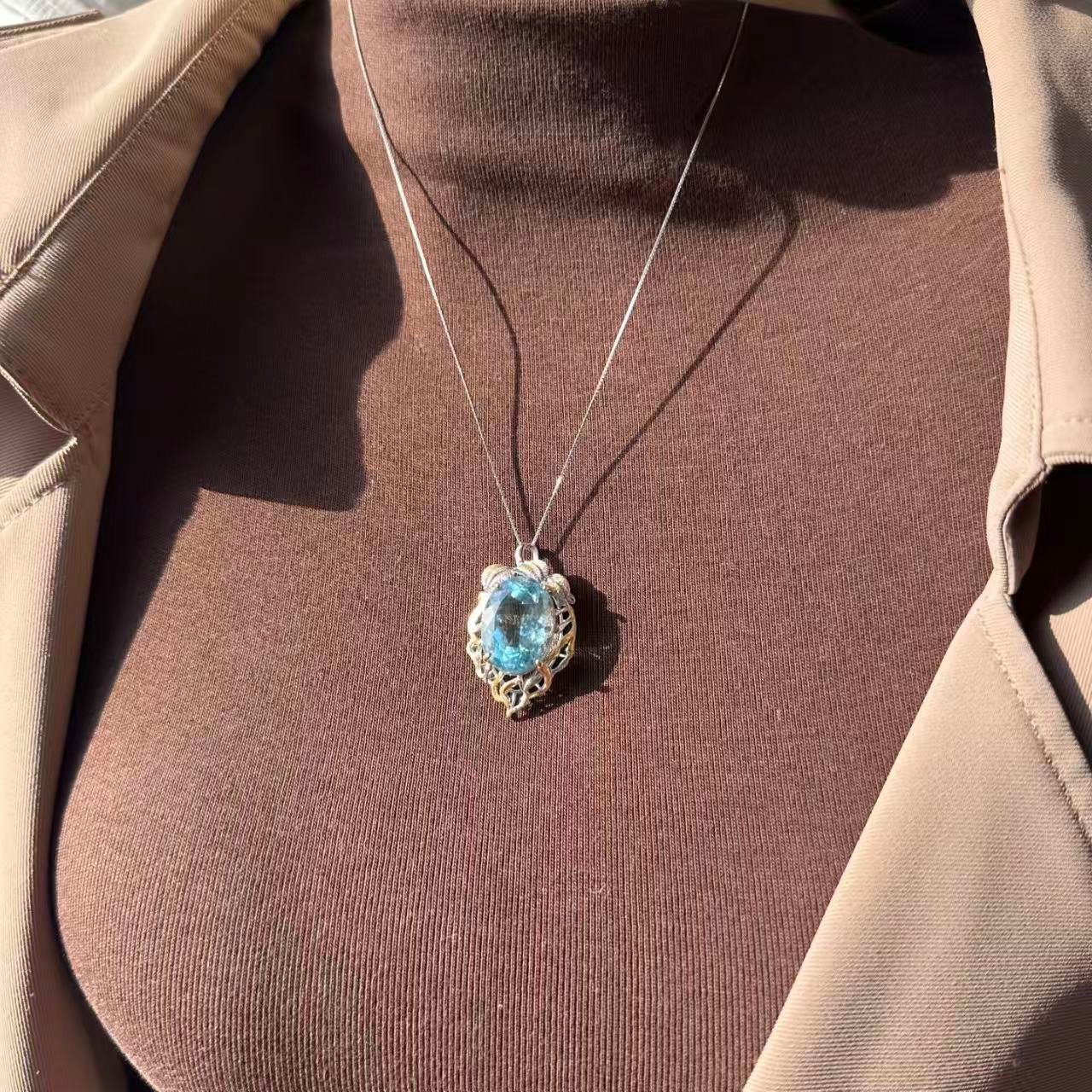 Natural superior Saint Maria Blue Sea Sapphire gemstone cut pendant necklace with 925 silver trim. The entire piece is adorned with natural superior Saint Maria Blue Sea Sapphire gemstone cut pendants. The original photo captured under natural light shows the unpolished stone measuring 19.8✖️14.5✖️9.8.
