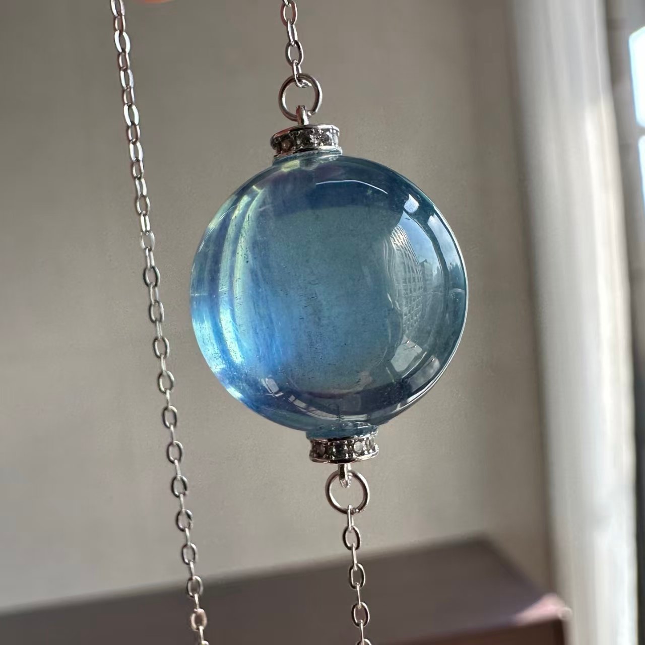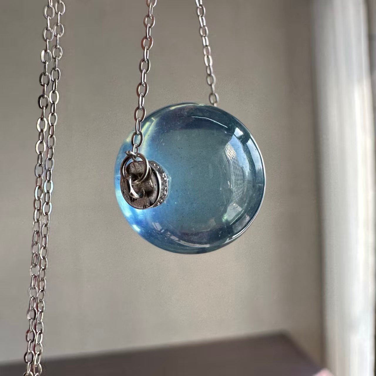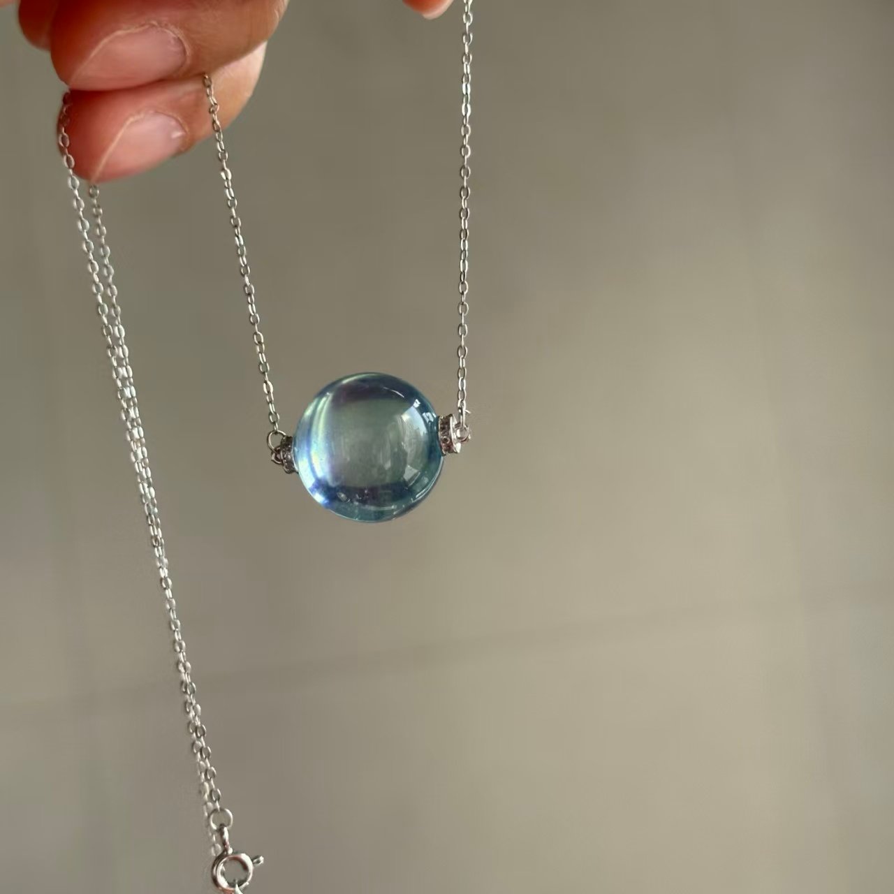Natural Supreme Saint Maria Blue Sea Sapphire Single Pearl Pendant. The entire piece is made of 925 silver set with a natural supreme Saint Maria blue sea sapphire single pearl pendant. The sweater chain is 17.2mm in length. The image shown is exactly as captured by natural light.