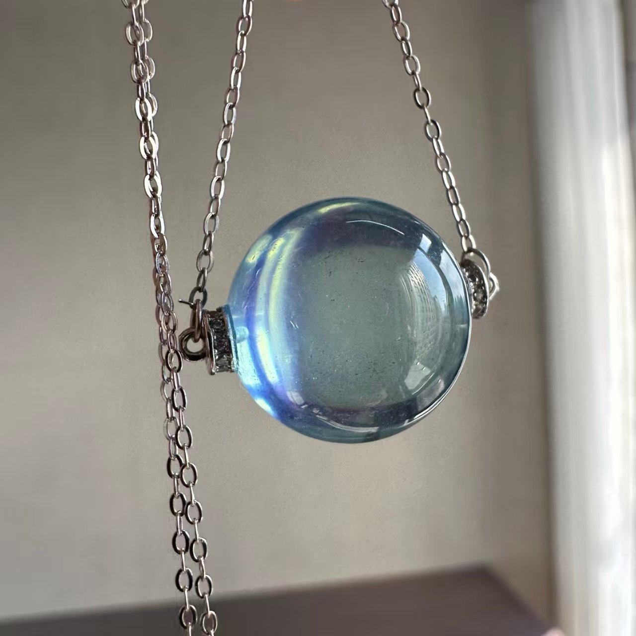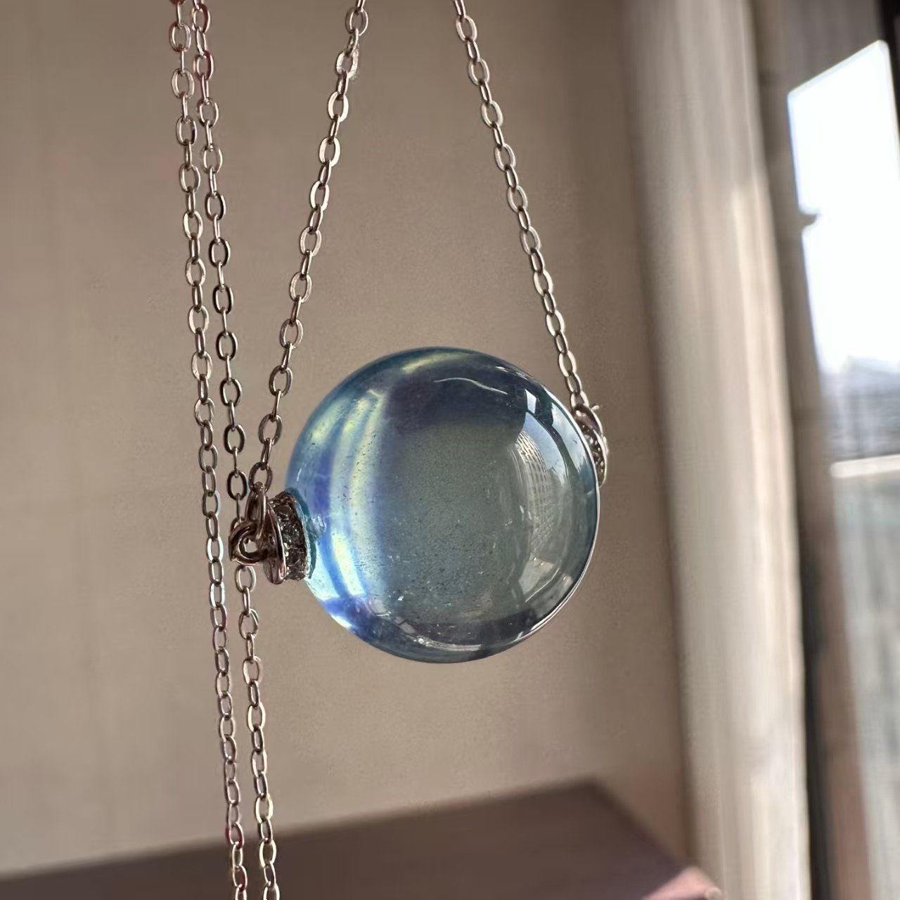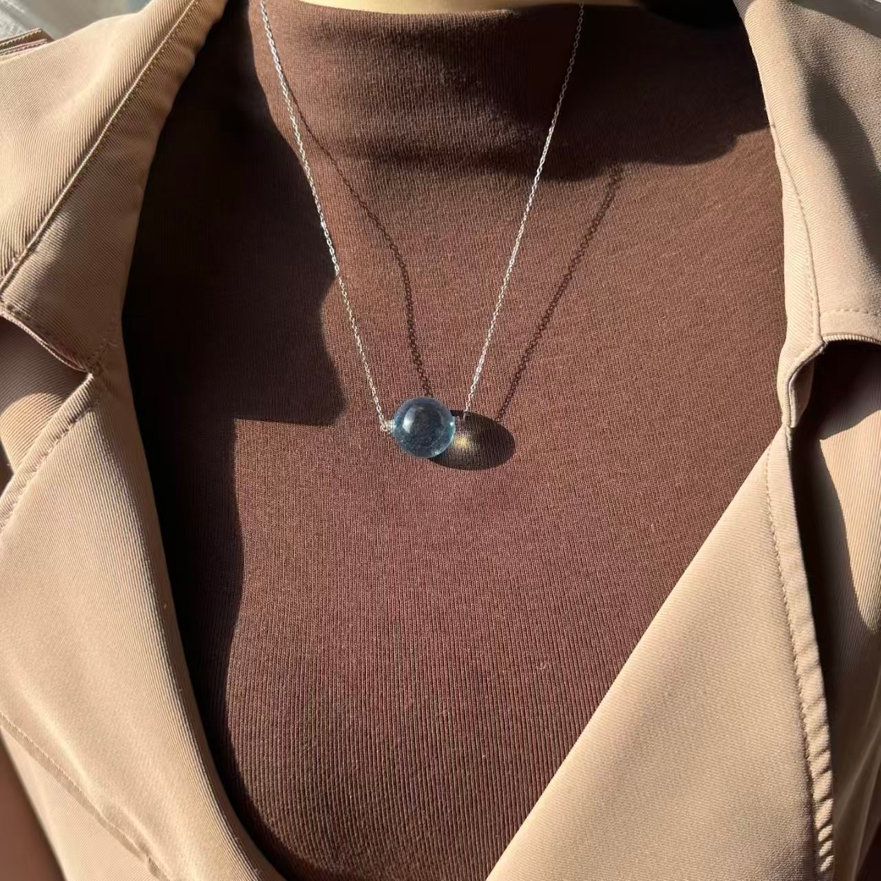Natural Supreme Saint Maria Blue Sea Sapphire Single Pearl Pendant. The entire piece is made of 925 silver set with a natural supreme Saint Maria blue sea sapphire single pearl pendant. The sweater chain is 17.2mm in length. The image shown is exactly as captured by natural light.